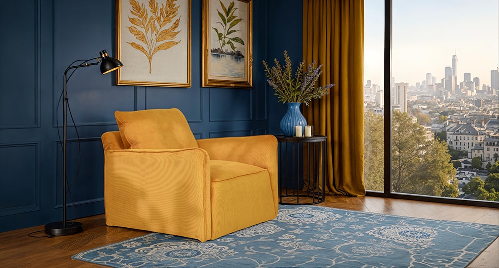 El sillón ocasional Narni es una pieza acogedora y funcional que destaca por su vibrante tapizado en tono mostaza, ideal para añadir un toque de energía y calidez a cualquier ambiente. Su diseño de líneas suaves y proporciones generosas lo convierte en una opción perfecta para momentos de descanso o lectura. Este modelo cuenta con función giratoria, lo que lo hace aún más versátil para espacios de convivencia como salas, estudios o rincones de lectura. Con su estética desenfadada y contemporánea, Narni es una excelente opción como punto focal o complemento decorativo en ambientes relajados. La estructura es de madera estufada, tiene resortes de acero templado, espuma en asientos de la dureza ideal para brindar soporte y confort y celdas en los respaldos para evitar que el relleno se compacte.