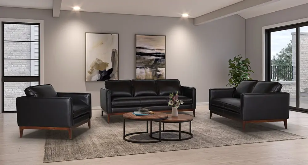 El modelo Franz combina elegancia y practicidad con un diseño transicional que destaca por su marco de madera y patas altas. Esta sala está tapizada en piel natural en las zonas de contacto, lo que lo convierte en una opción sofisticada y duradera.